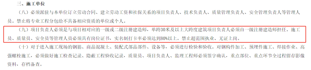 通知明确:项目负责人必须是与项目相对应的一级或二级注册建造师,单跨30米及以上大跨度建筑项目负责人必须由一级注册建造师担任。