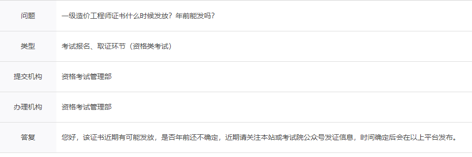 近日有考生咨询:一级造价工程师证书什么时候发放?年前能发吗?